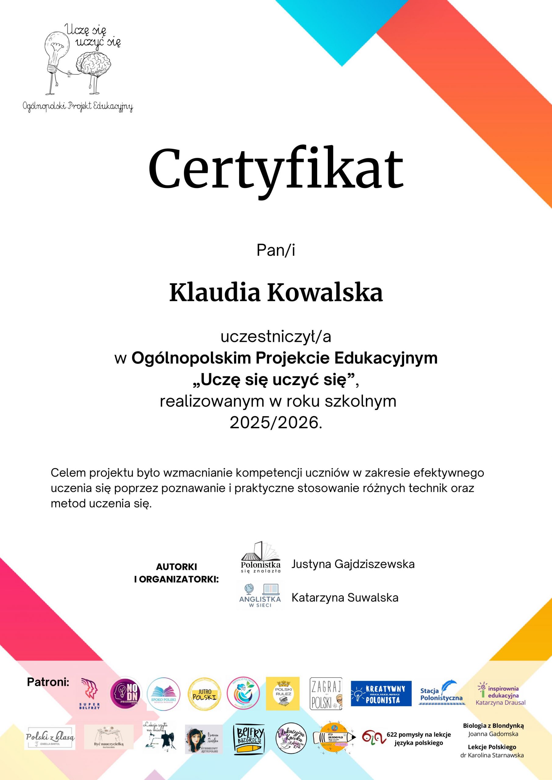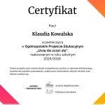 Z radością informujemy, że uczniowie klasy 4 wzięli udział w ogólnopolskim projekcie edukacyjnym „Uczę się uczyć się”, realizowanym podczas zajęć z wychowawcą. Celem projektu było rozwijanie umiejętności efektywnego uczenia się, budowanie motywacji oraz kształtowanie postawy odpowiedzialności za własny rozwój.