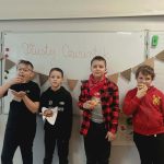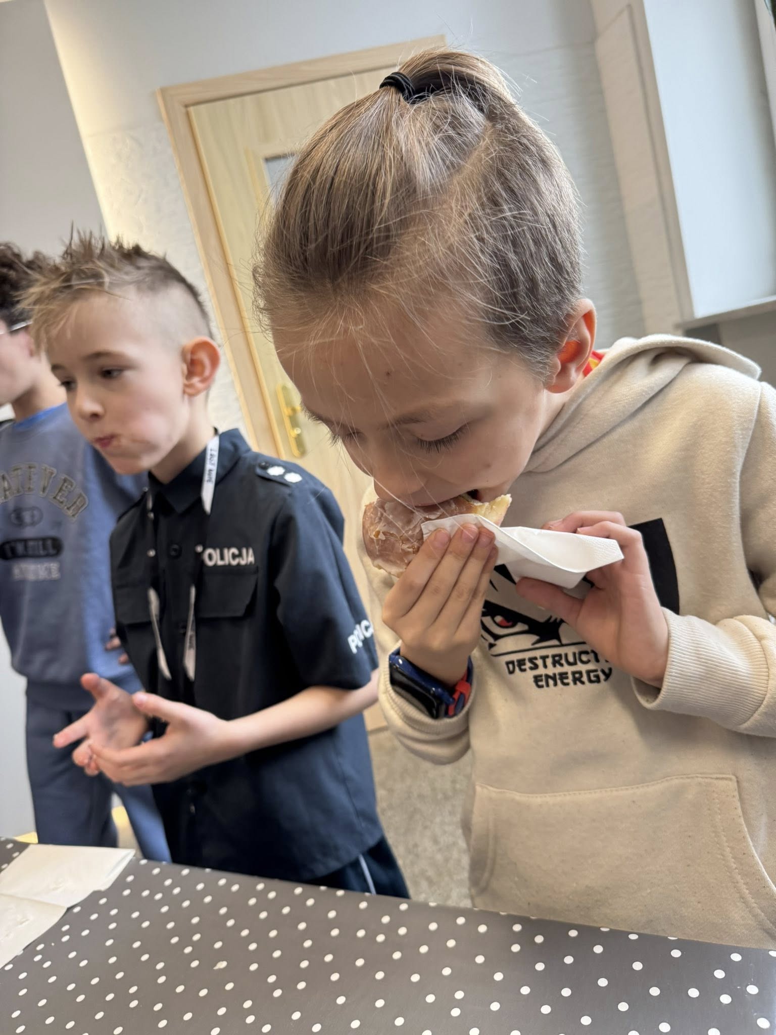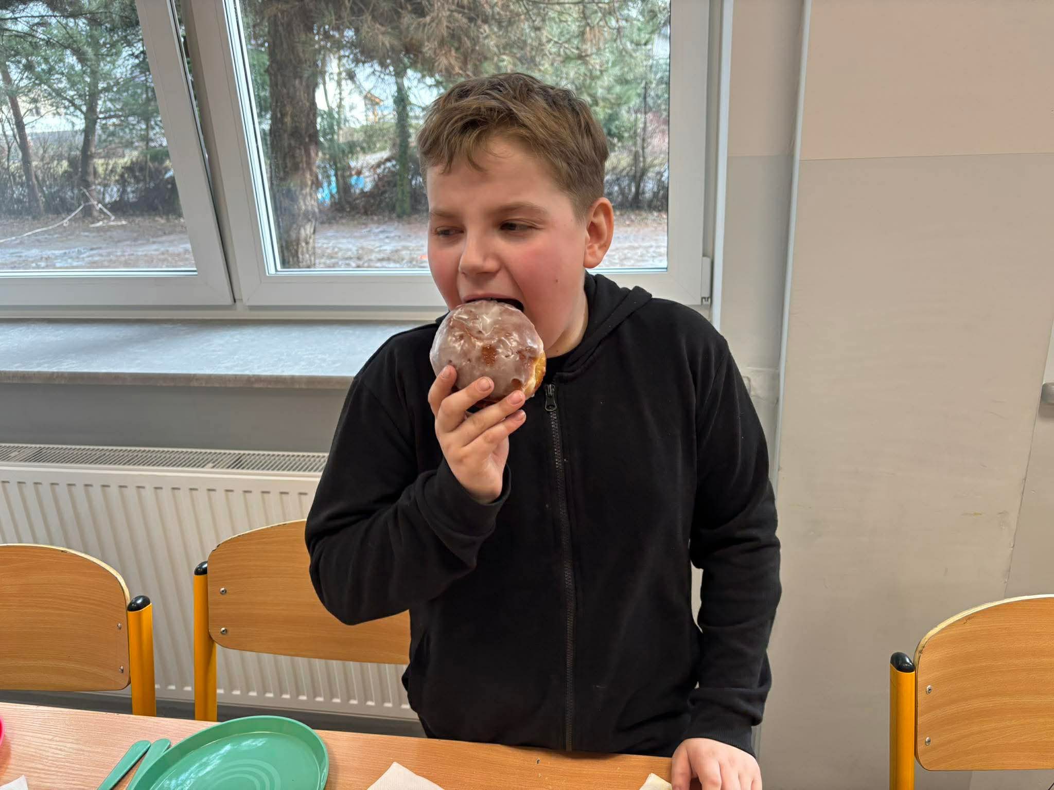 Wśród uczniów klas 1–4 bezkonkurencyjny okazał się Jarek z klasy 4, który najszybciej i najsprawniej poradził sobie z pączkiem, nie łamiąc zasad konkursu.