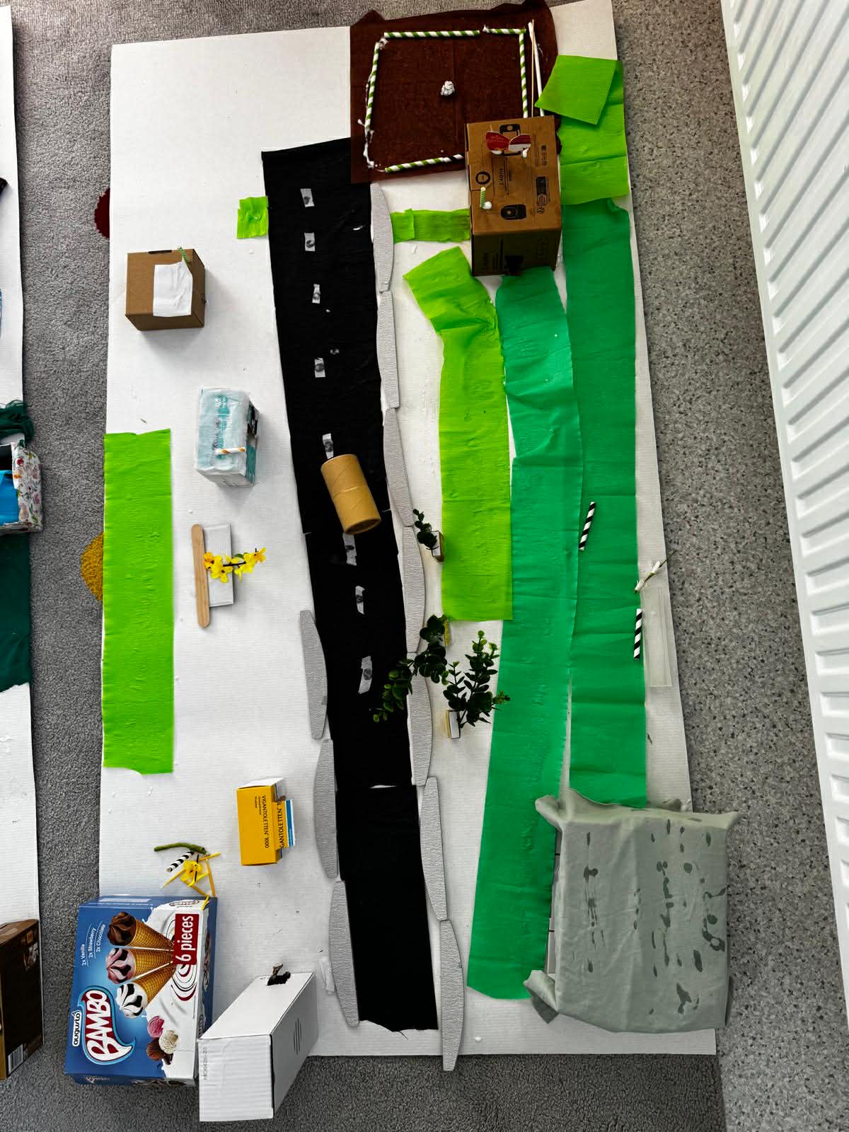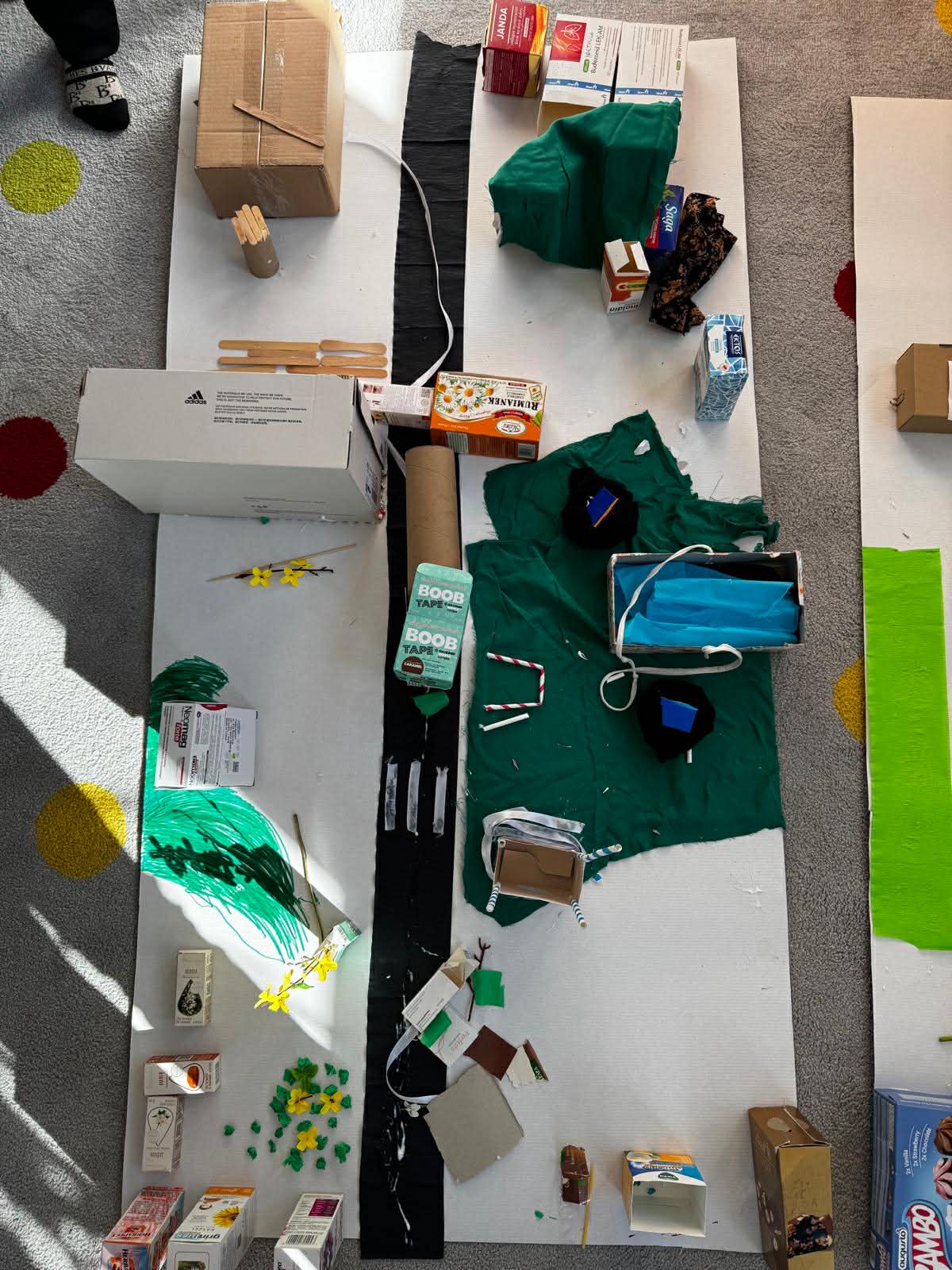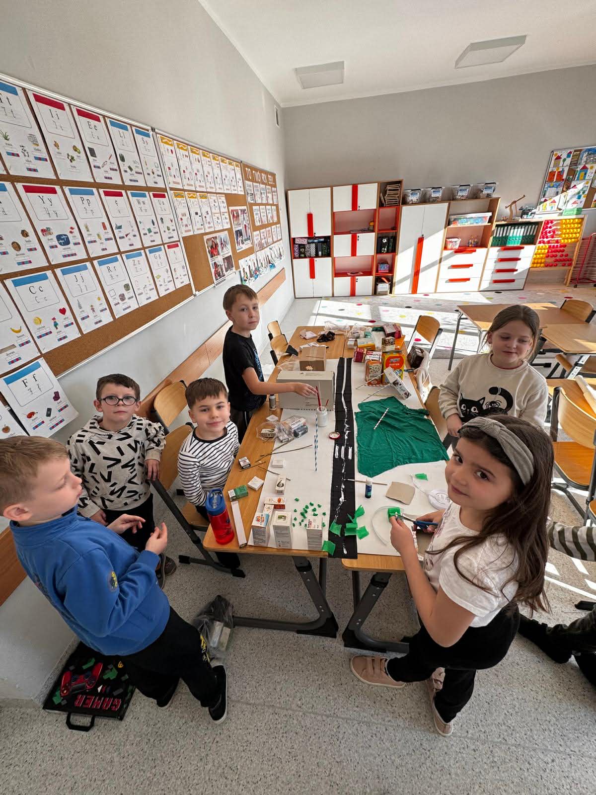Pracując w grupach, uczniowie wspólnie planowali rozmieszczenie najważniejszych budynków oraz infrastruktury drogowej. Na przygotowanym planie umieszczali domy, szkołę, sklepy oraz drogi, dbając o ich właściwe połączenia. Podczas pracy dostrzegli również, jak ważne dla codziennego funkcjonowania kierowców są takie miejsca jak stacja benzynowa, warsztat mechaniczny, stacja kontroli pojazdów oraz posterunek policji. Zgodnie uznali, że te obiekty powinny znaleźć się w ich miejscowości lub bezpośrednim sąsiedztwie.