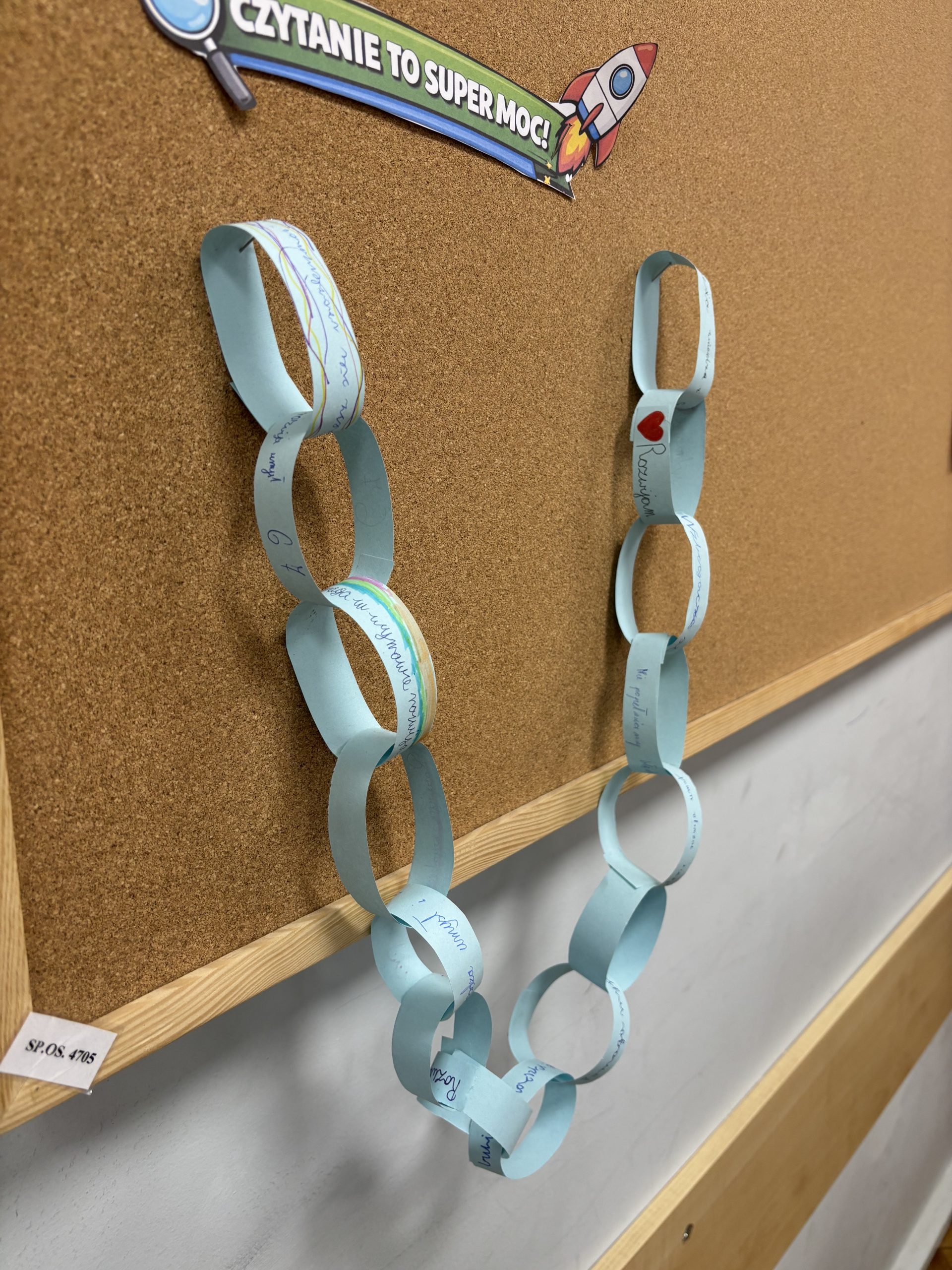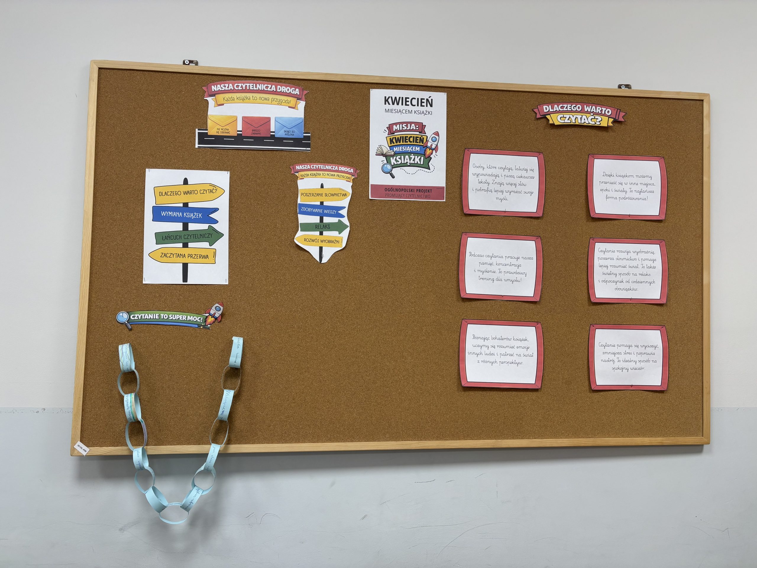 Na pierwszych zajęciach uczniowie klasy IV zastanawiali się nad tym, dlaczego warto czytać, jakie książki lubimy i dlaczego oraz co daje nam kontakt z literaturą. Powstał także łańcuch zalet czytania, na którym zapisano hasła związane z korzyściami płynącymi z czytania.